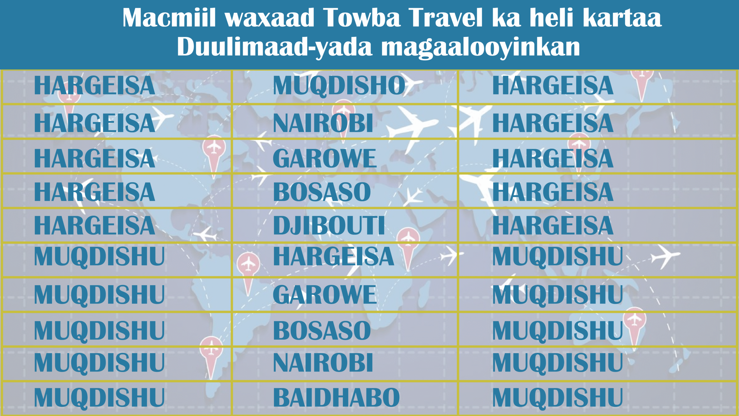 | ISNIIN | DALLO AIRLINES / SAACID AIRLINES | HARGEYSA TO MOGADISHU |
