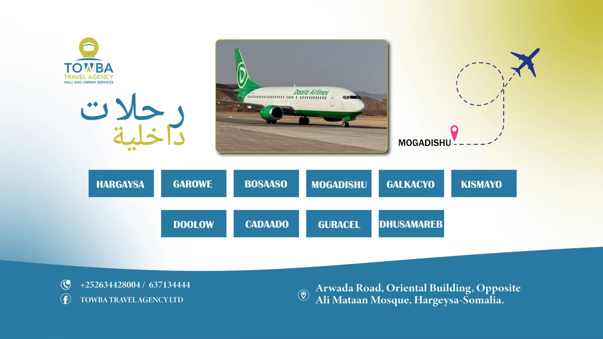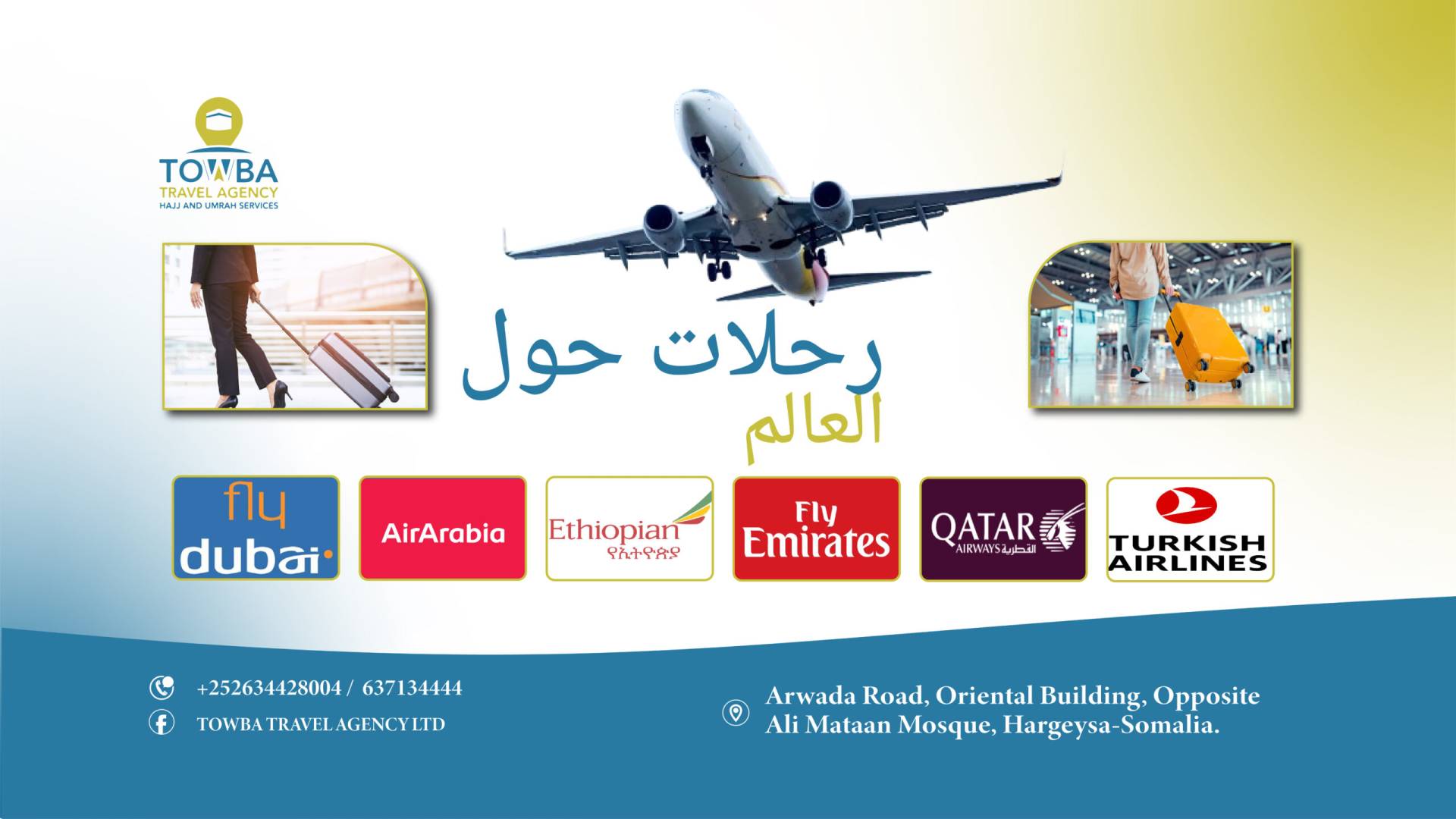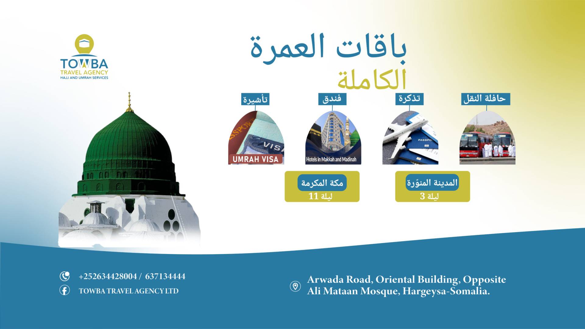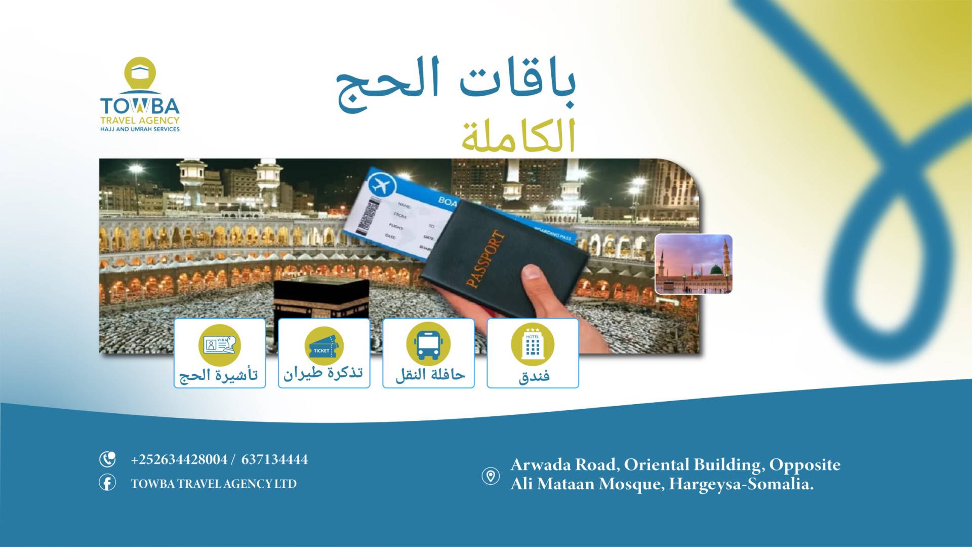 Towba Travel Agency waa shirkad safar oo Soomaaliyeed oo ku takhasustay qabanqaabada safarrada barakaysan ee Hajj iyo Cumro. Ujeeddadeennu waa in aan fududeyno safarka cibaadadaada adigoo helaya adeeg ammaan ah, raaxo leh, iyo hagid ruuxi ah oo dhammeystiran.